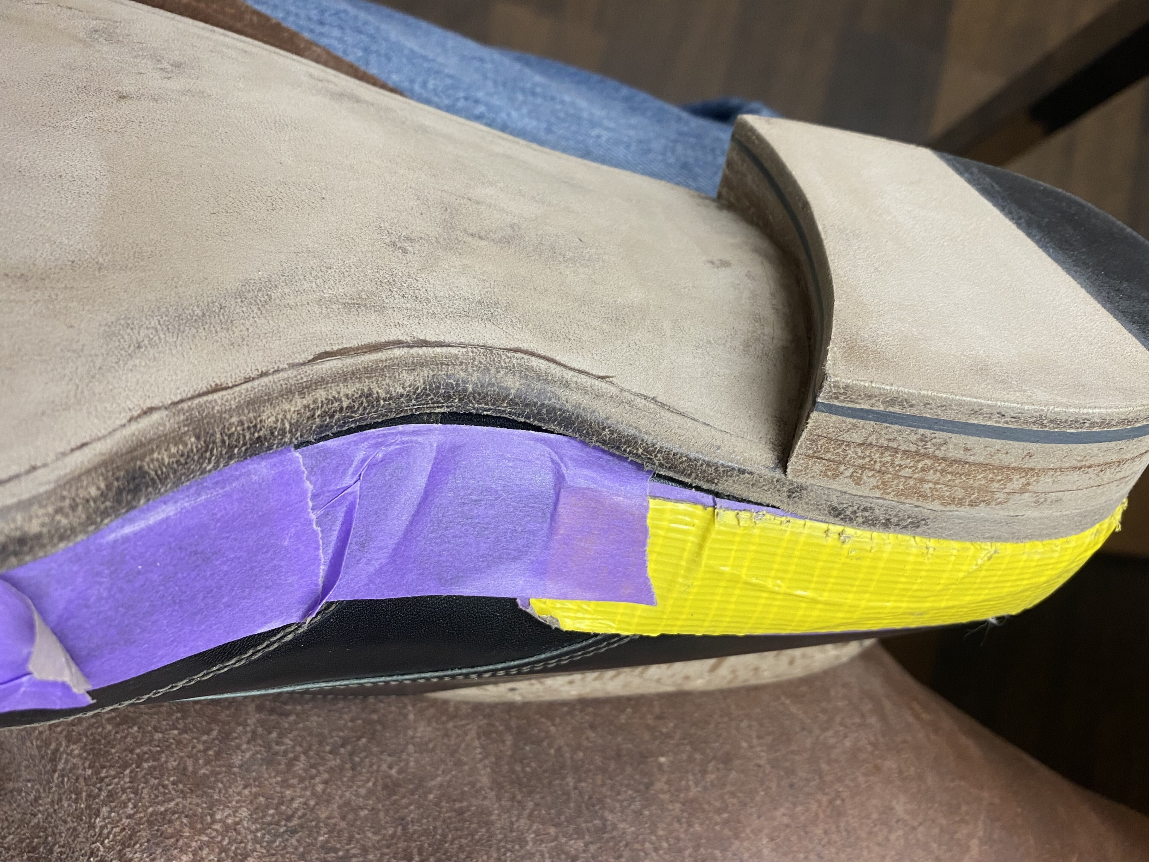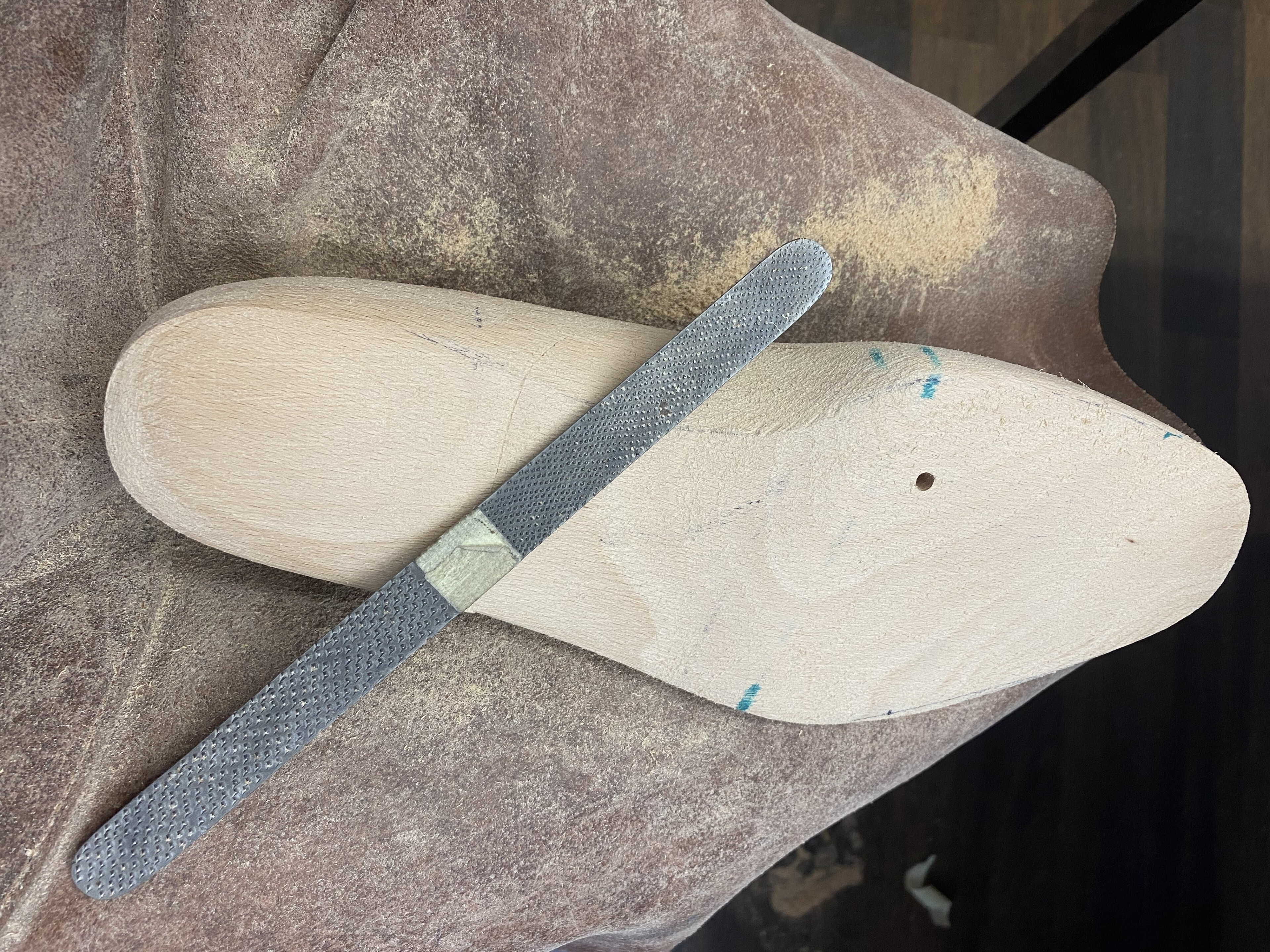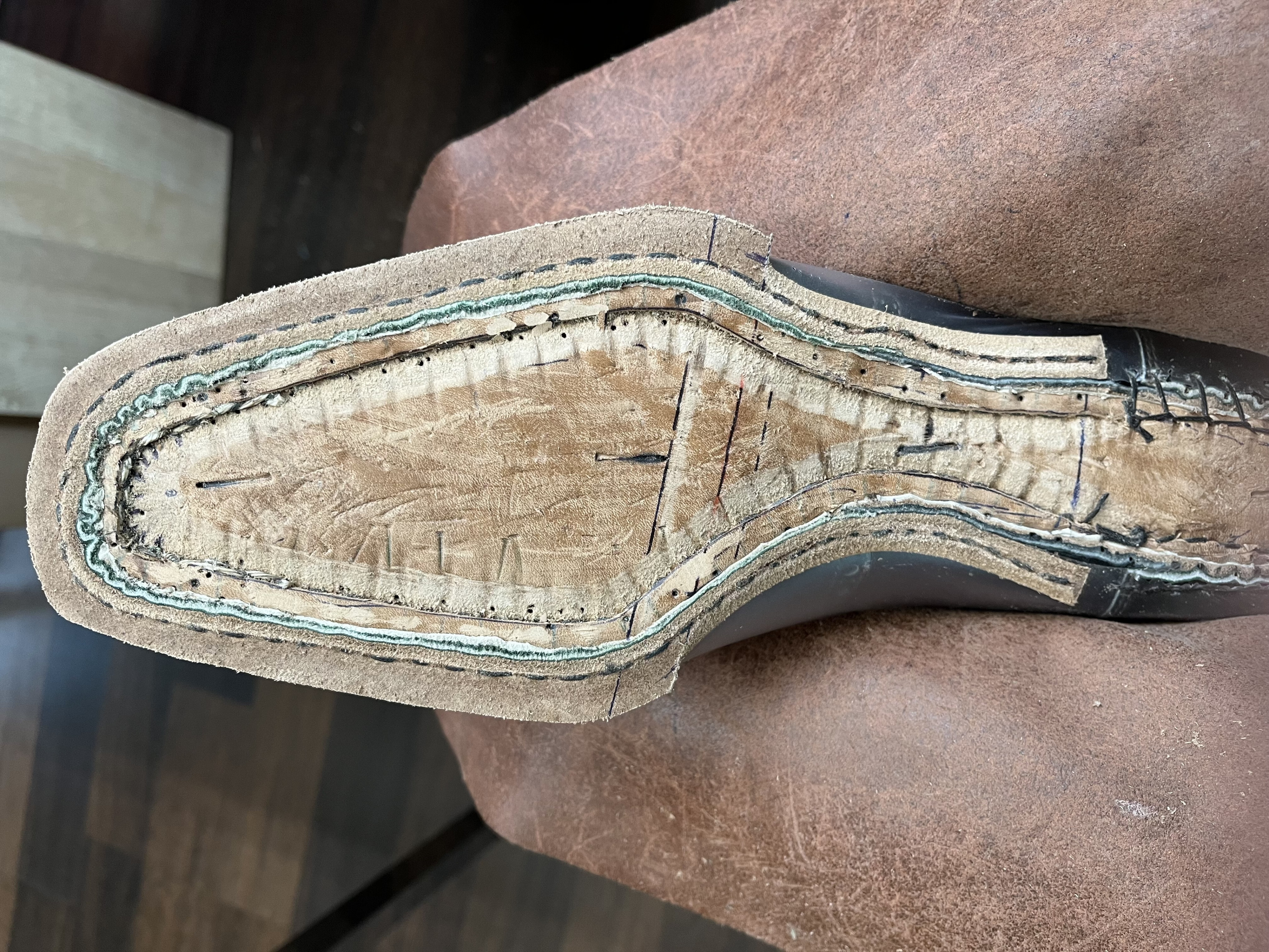 Bodenbau. Die Ausballung der Lauffläche mit Kork ermöglicht die Bildung des persönlichen Fussbetts. Der Bereich im Gelenk wird mit Leder & Holz verstärkt, was den Fuss im Gewölbe unterstützt und ein Durchbiegen des Schuhs verhindert. Die Laufsohle wird sodann angebracht und mit dem Rahmen vernäht (gedoppelt). Zum Schluss wird der Absatz schichtweise bis zur gewünschten Höhe aufgebaut.