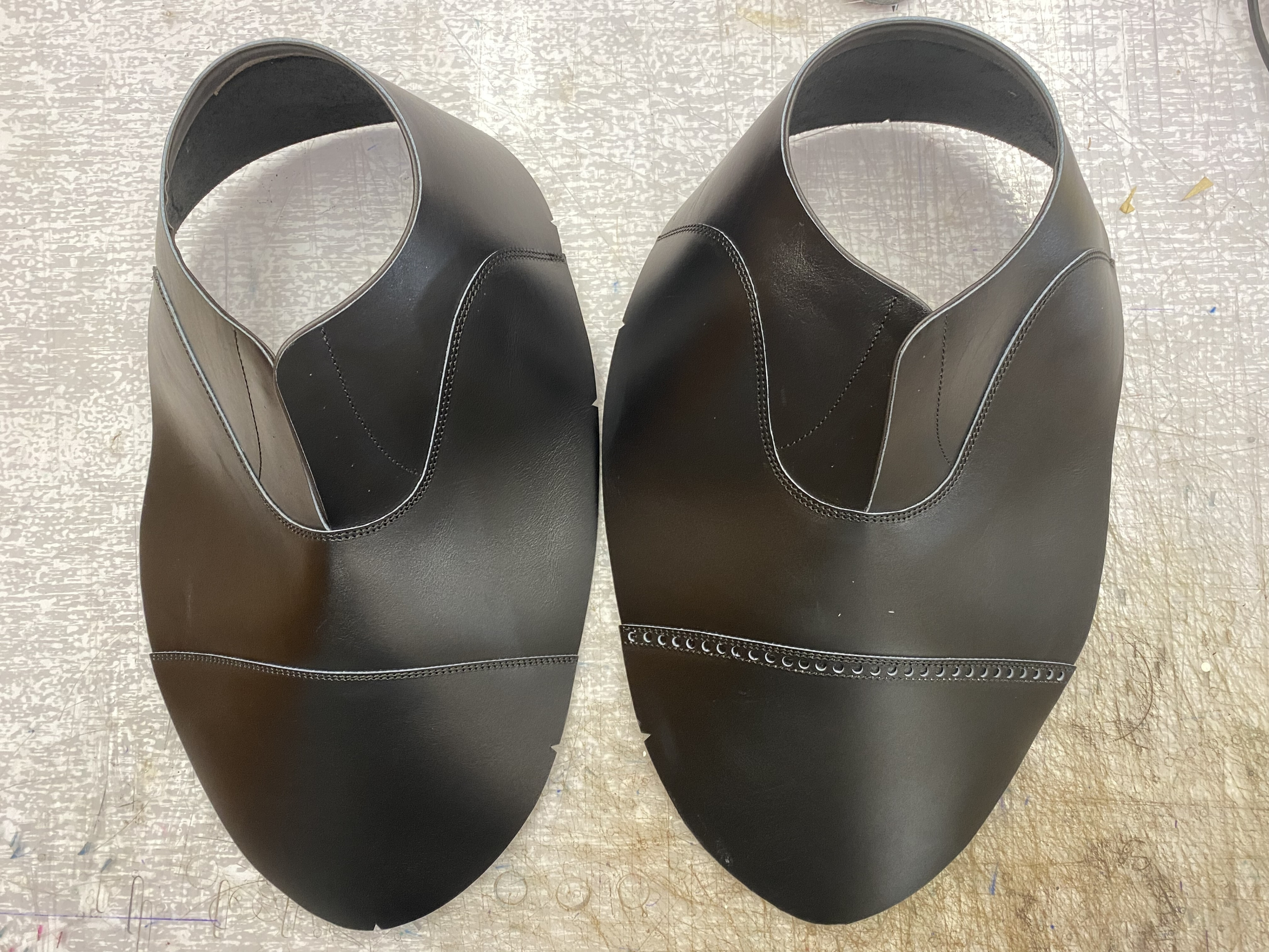 Schaftbau. Das Design des Schuhs wird direkt auf den Leistengezeichnet. Die Formen der einzelnen Lederteile werden abgenommen, aus dem Leder geschnitten und zum "Schaft" (Oberteil) zusammengenäht. Der Schaft wird dann mit einem Futterleder ausgekleidet, was den Tragekomfort und die Stabilität des Schaftes erhöht.